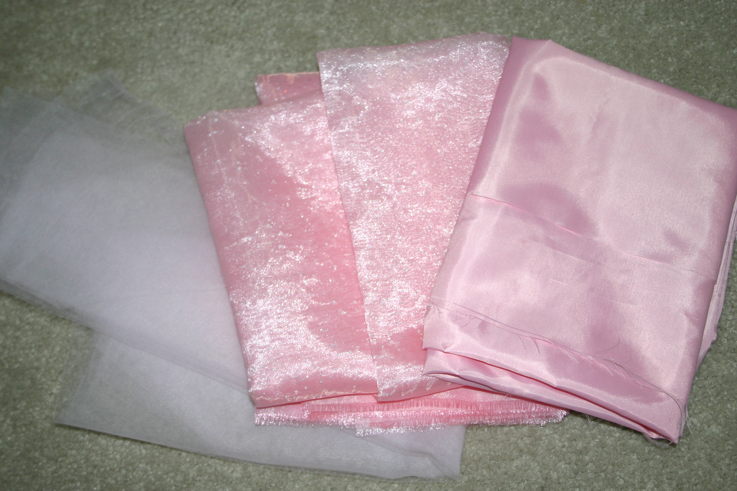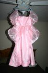 I decided that instead of buying a princess dress I would attempt to make one. I started my project on Monday night when I went and bought all my supplies. It was fun to pick out a pattern and to then pick out the material and color. Her favorite color is pink, so of course I had to make her a pink dress. I have never worked with satin or sheer fabrics, but I was up for the adventure.