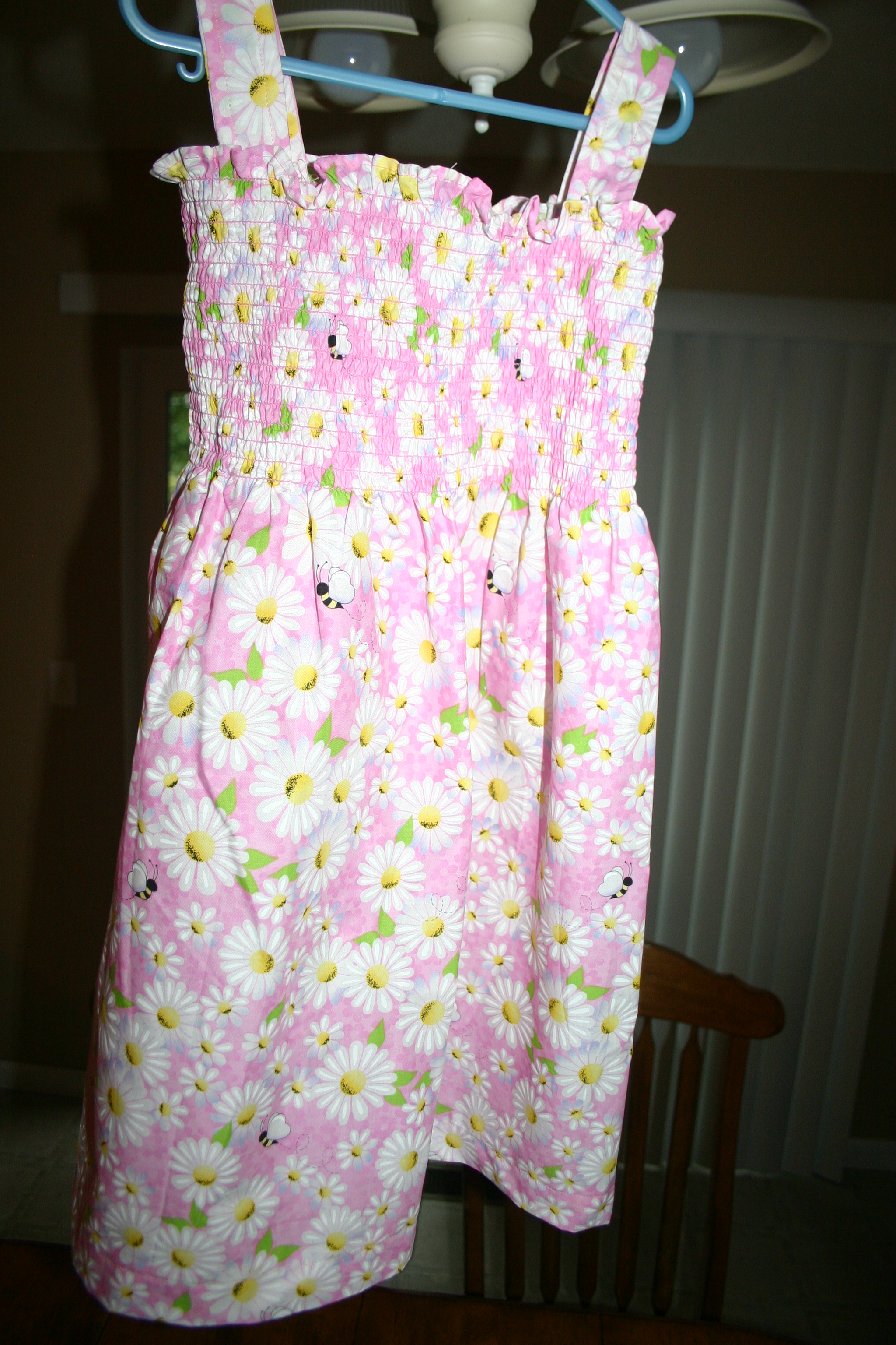 Part way through the project I was frustrated with the fabric but things were going ok, I only had to tear out my work a few times. But I decided to take a break from the satin and sheer and work with some cotton for a little bit, so I whipped up what is now my new favorite dress for Ally. It was completed in less than an hour. I will defiantly be making this type of dress again.
