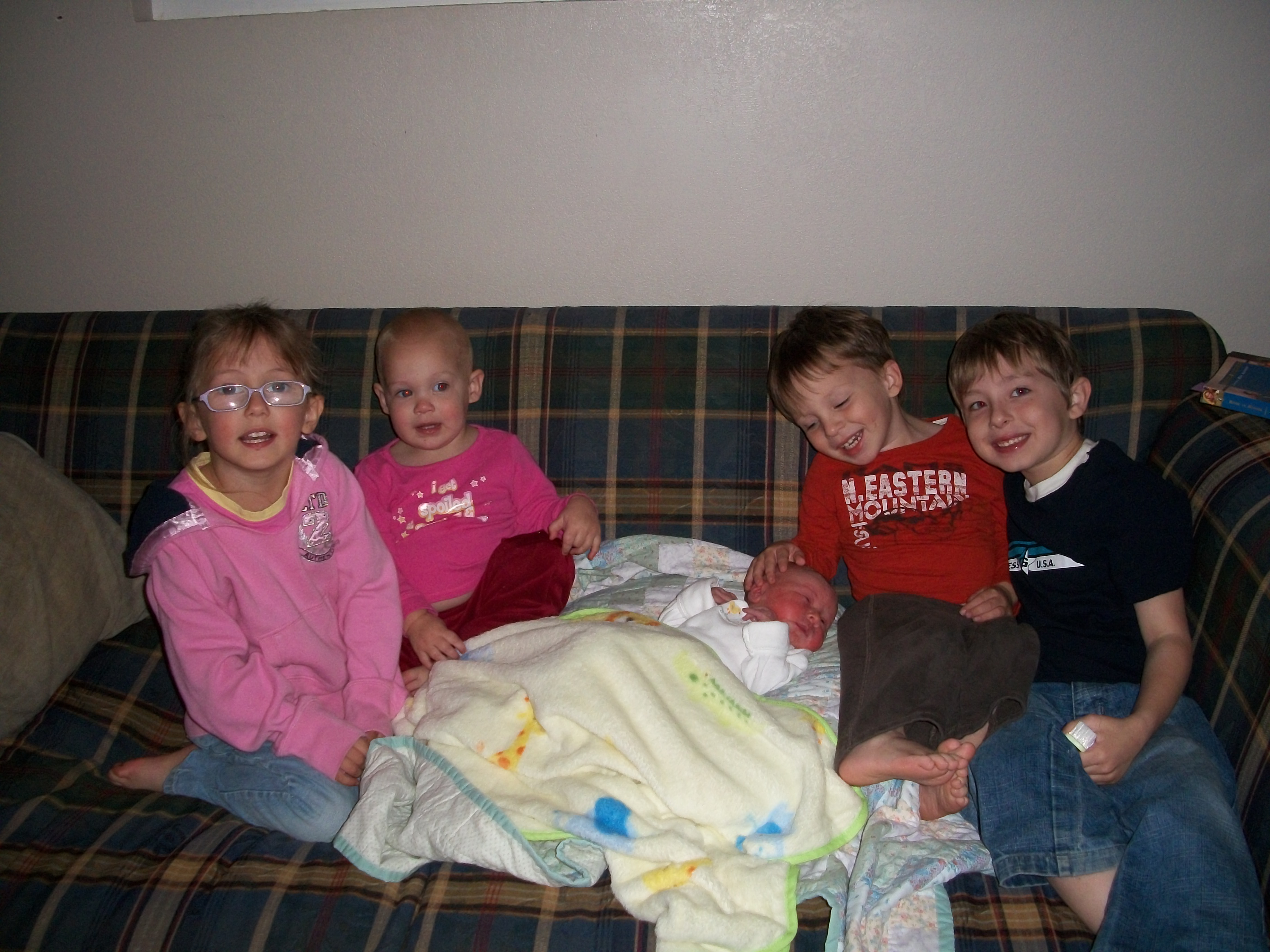 As I mentioned in the last post the kids were watching a movie on the other side of the house when I had Teagan. After it was all over Mark heard them come into the kitchen so went to check on them. They were looking for a snack and had no idea they had a new sister. So he asked them if they would like to meet their new sister, they very casually said sure and came quietly into my room to look at her. They were all very happy she was here but were pretty subdued.