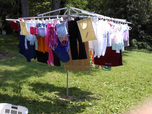 In the home we are renting the laundry room is right next to the thermostat. I have found in the last few weeks that is not a very good thing in summer when you use your dryer. My AC ran non stop all day on laundry day. My solution? I bought an outside umbrella line dryer. It came earlier this week and I got it installed this morning. Good thing because laundry was piling up around here. So far so good with the AC running. Now I will just have to see what I think about the feel of line dried clothing. If you have any tips for me please comment.