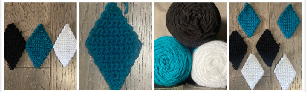 If you want to make a diamond, don’t cut the yarn, chain 1, turn, and follow the rest of the pattern… You will need an uneven amount of rows in your triangle for the diamond pattern. Then all you have to do is decrease each row by one stitch. The decreases is made at the end of each row in the last two stitches of the row.