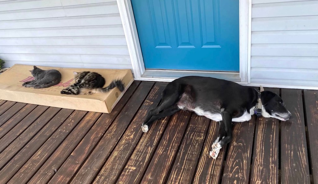 When we got kittens to help take care of a mouse problem, he assumed the role as the friend and “daddy” to them as well. He was always so gentle with them when they wanted to play. They slept together all snuggled up.